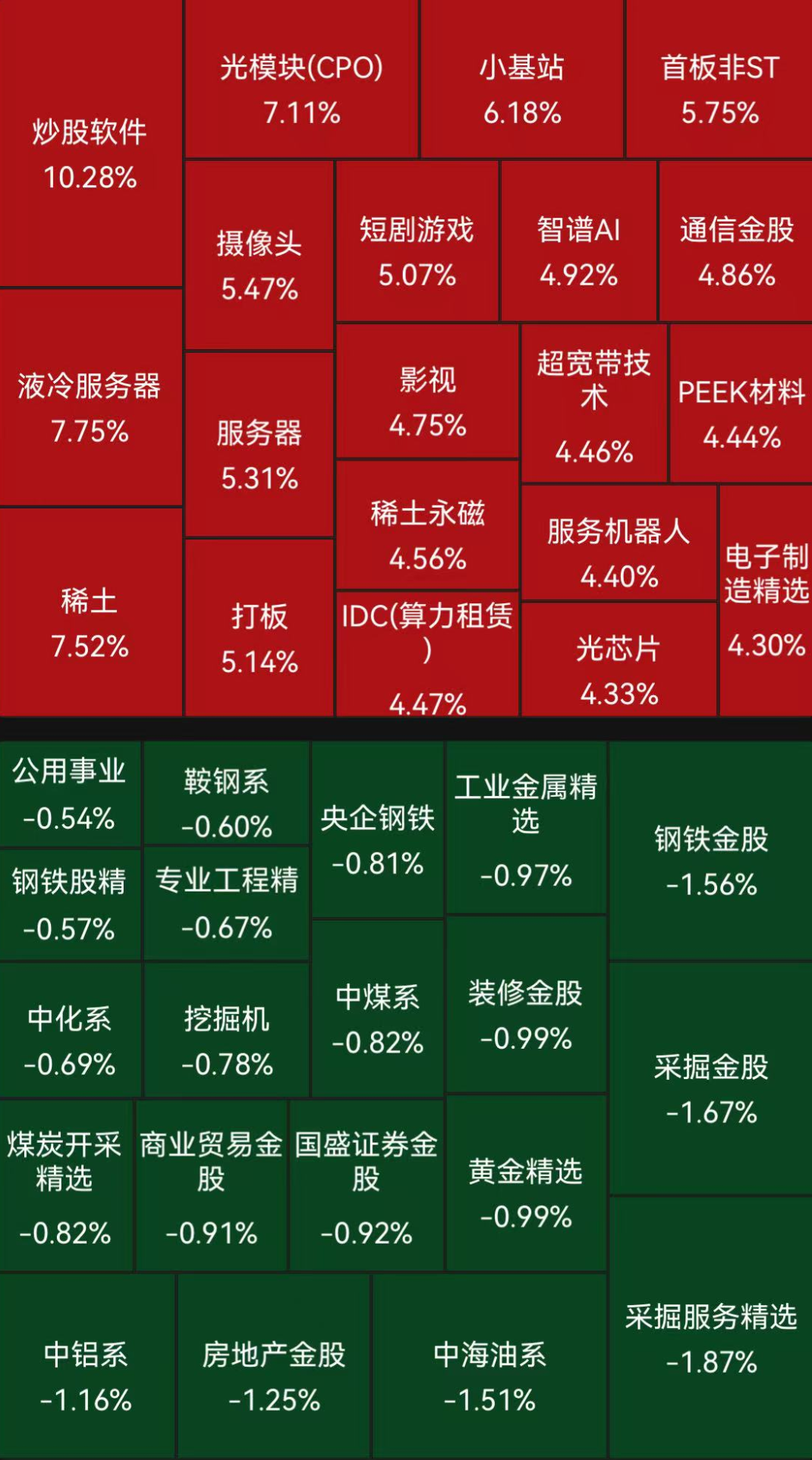 板块方面,券商、金融科技等大金融股一度冲高,指南针、同花顺双双续创历史新高。液冷服务器、影视、CPO、稀土永磁等板块涨幅居前,煤炭、有色金属、钢铁等板块跌幅居前。