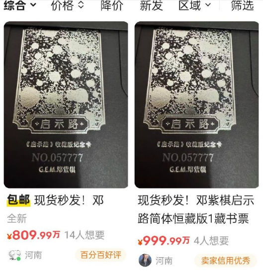 8月17日,多名邓紫棋粉丝表示,自己在二手交易平台上刷到了定价超级高的“靓号”收藏编号卡,比如编号“057777”这样比较特殊的编号,当前二手平台上已将相关商品下架了。一名邓紫棋粉丝透露,几天前就人刷到了收藏编号卡,询问发布该商品信息的博主这是哪里来的,对方回应说是“特殊手段”,还有粉丝去二手交易平台“钓鱼”问话,试图得知这些收藏编号卡怎么来的,要求卖家出示购买记录,卖家称是“朋友给的”。这一情况引发了不少还没有收到货的消费者的担忧:“难道书被掉包过了吗?”“我明天还要不要签收啊?”同时也有不少邓紫棋的粉丝表示愤怒不满“这是邓紫棋给粉丝的福利,怎么能被拿来谋私利?”“名人效应给你们玩明白了,怎么能拿着粉丝的爱来哄抬价格赚钱?”