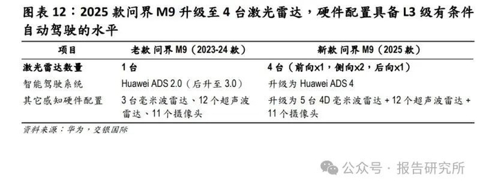 法规层面,根据即将于 4 月 1 日起实施的《北京市自动驾驶汽车条例》规定, 将支持自动驾驶汽车用于个人乘用车、城市公共汽电车、出租车、城市运行保 障等出行服务。这不仅为 L3 级自动驾驶汽车的合法上路提供了法规依据,还 推动了自动驾驶技术的商业化落地、基础设施建设、数据安全管理等多个方面 的发展。我们预计未来将有更多地方政府陆续出台类似法规,推动 L3 级及以 上自动驾驶加速规模化应用。随着各地甚至国家层面相关法规的出台,自动驾 驶汽车的上路规则、事故责任认定标准和赔付主体将更加明确,网络安全、数 据安全等配套法律也会更完善。 随着L3级有条件自动驾驶法规逐步落地,安全主体可能从驾驶员转向整车厂。 面对高额事故赔偿风险,整车厂必须构建超高冗余感知系统,有望带动激光雷 达搭载量进一步提升。2025 款问界 M9 激光雷达的总数从之前的 1 台升级到了 4 台,硬件配置已经支持 L3 级别自动驾驶。