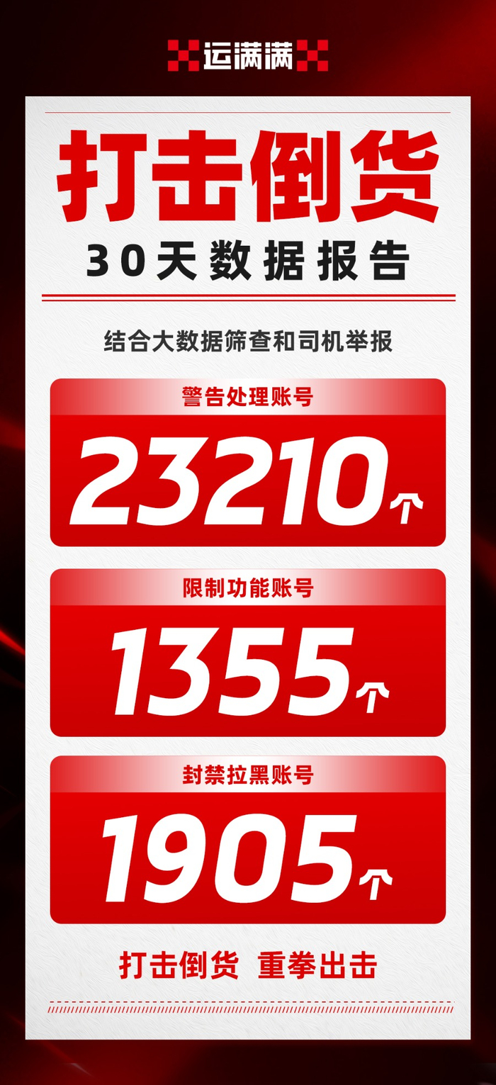 自7月15日运满满正式发布《倒货清源 携手出击 致货车司机的倡议书》以来,这场由平台牵头的"倒货清源"专项行动已持续开展一个月。数字货运平台运满满通过“大数据筛查+司机举报”双管齐下,重拳打击倒卖货源信息、压价扰乱市场等违规行为,取得阶段性成果。8月15日,平台公布首月治理成果:累计警告处理账号23210个,限制功能账号1355个,永久封禁拉黑账号1905个,并公开部分违规账号名单,获得广大货车司机的高度支持。