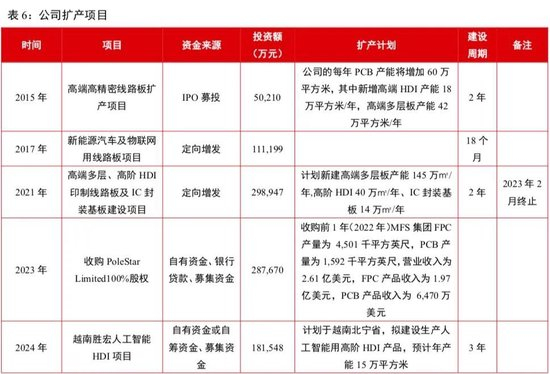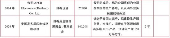 2024年5月,公司计划不超2.6亿美元在越南投资建设高精密度印制线路板项目,生产高多层印制线路板和HDI。8月,公司以2.79亿元收购APCB Electronics,布局泰国生产基地。