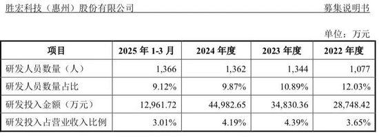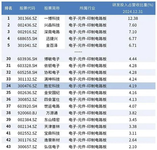 2022年至2024年及2025年前3月,胜宏科技的研发费用占营业收入的比例分别为3.65%、4.39%、4.19%和3.01%,显著低于行业7%-10%的平均水平。