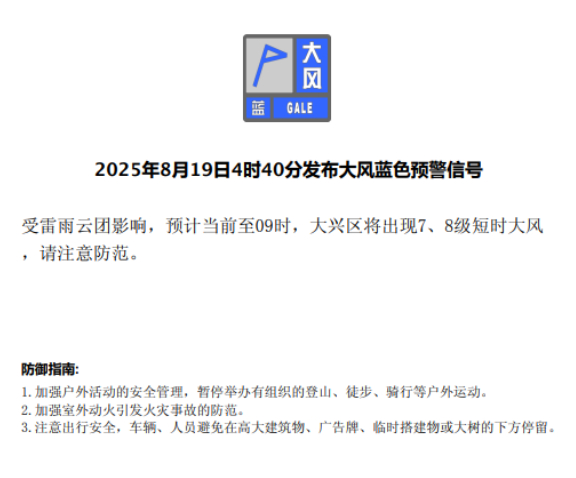 4时40分,区气象台发布大风蓝色预警信号:受雷雨云团影响,预计当前至09时,大兴区将出现7、8级短时大风,请注意防范。