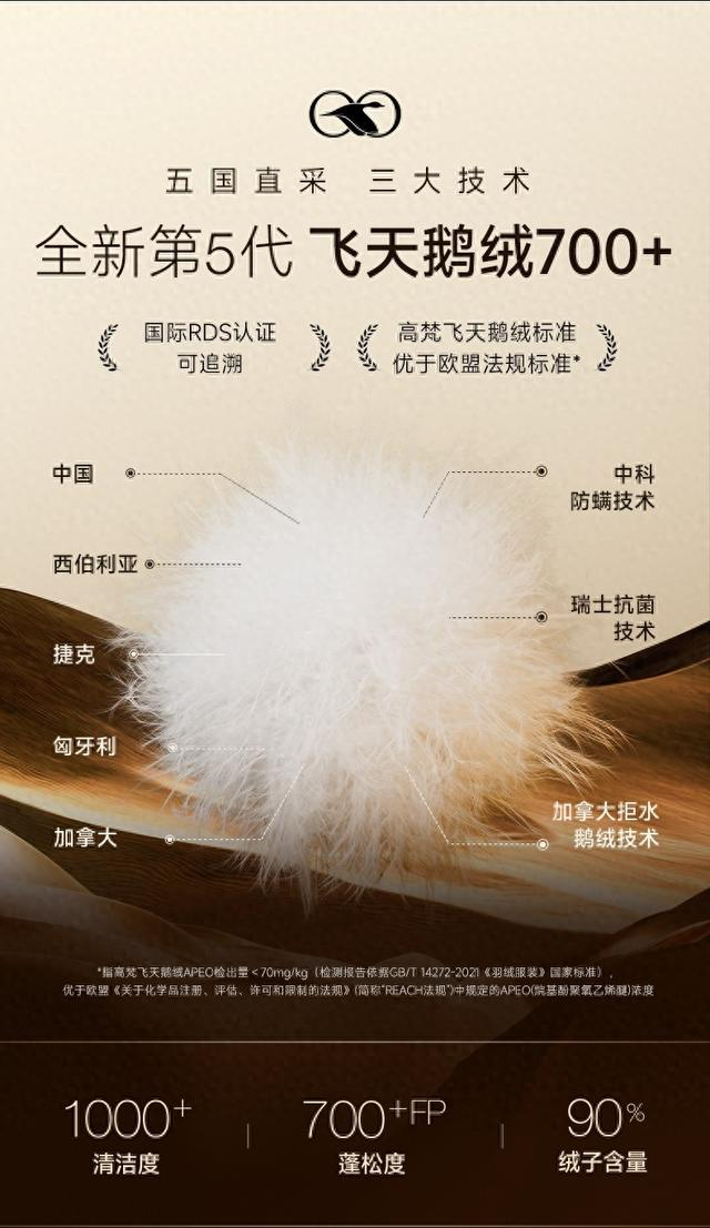 高梵对原料的把控贯穿全流程:从绒毛采集、清洗消毒到分级筛选,均遵循严苛标准。通过手工筛选,确保所用鹅绒的品质——清洁度可达到1000+,蓬松度超过700+,绒子含量高达90%以上。2024年,高梵成为中国进口匈牙利鹅绒量第一的品牌,通过对原料品质的把控,为产品性能提供了稳定保障。