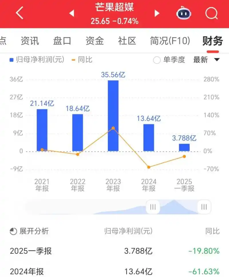 数据显示,芒果超媒2024年实现营收140.80亿元,同比下滑3.75%;归母净利润则大降61.63%。这一净利润的降幅,创出上市10年来的最大跌幅。2025年一季度,芒果超媒的营收、归母净利润再度分别下降12.76%和19.80%。