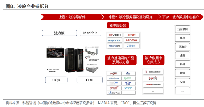 中游主要包括浪潮、联想等服务器制造商,以及曙光数创、英维克、申菱股份等液冷解决方案提供商;下游主要客户为互联网厂商、三大运营商、政府、科研院所等机构。