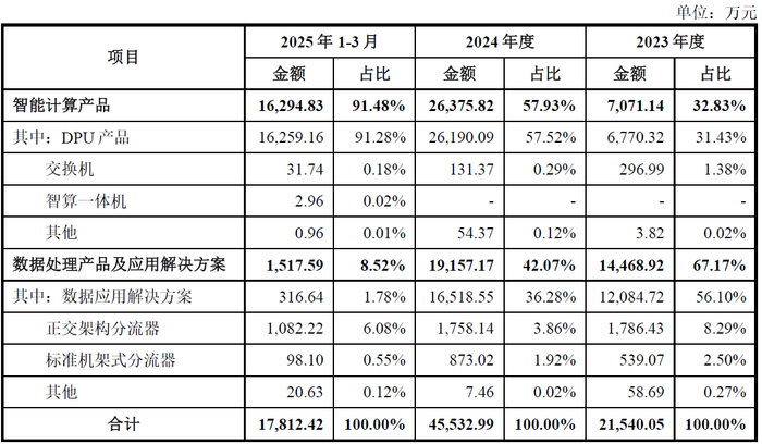 界面新闻进一步拆分发现,数据处理产品及应用解决方案毛利率有一定波动,真“拖后腿”的是智能计算产品,其毛利率从2023年的55.48%降至2024年的30.13%,到2025年第一季度下降至12.65%。
