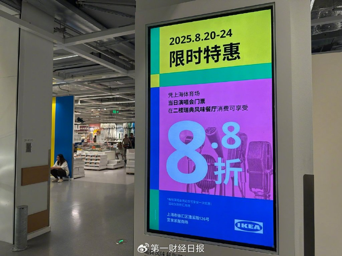在上海体育场附近的宜家则做起了“票根经济”的生意,第一财经记者在现场看到,持有时代少年团演唱会门票者,演唱会期间在宜家商场内餐厅用餐可享8.8折。