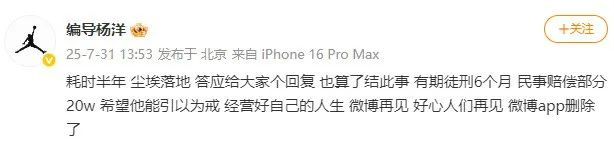7月31日,车主@编导杨洋 发文称:“耗时半年,尘埃落地,答应给大家个回复,也算了结此事。有期徒刑6个月,民事赔偿部分20万元,希望他能引以为戒,经营好自己的人生。”