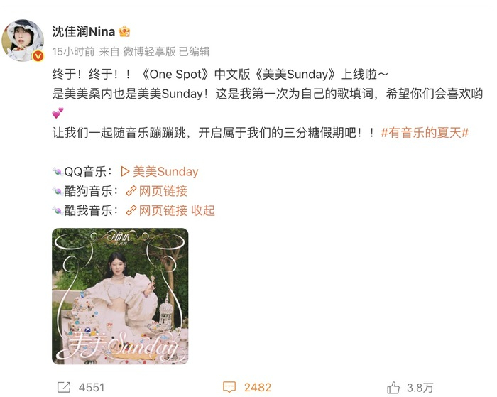 沈佳润发布官方微博写道,终于!《One Spot》中文版《美美Sunday》上线啦,是美美桑内也是美美Sunday!这是我第一次为自己的歌填词,希望你们会喜欢哟,并附上各大音乐平台的歌曲链接。该条微博有2千多条评论,有人说“这个填词好萌啊,好清爽的一首夏日歌”。