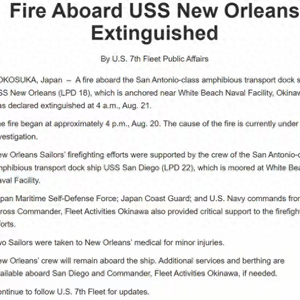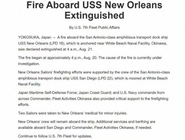 当地时间8月21日,美国海军第七舰队发布公告称,其驻扎在日本的“新奥尔良”号两栖船坞登陆舰于8月20日16时发生火灾,最终火灾于8月21日凌晨4时被扑灭,事故造成2人轻伤。