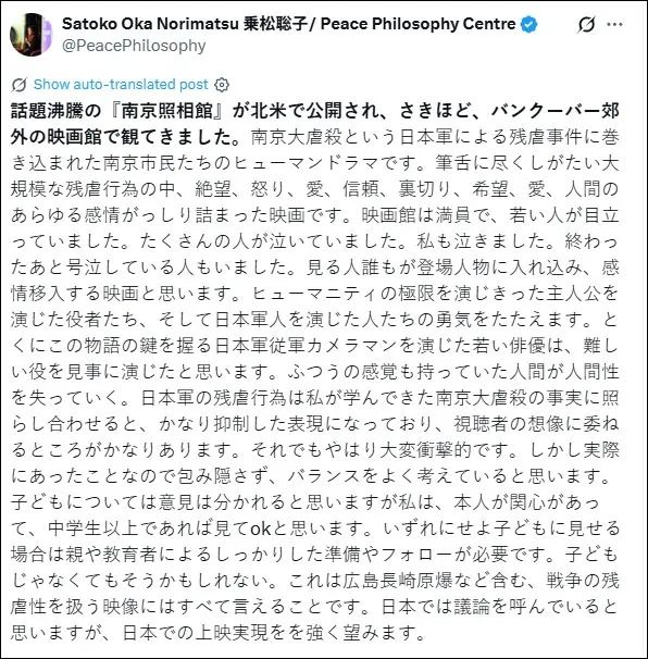 讽刺的是,在乘松聪子的推特发帖下,不止一位日本网民荒谬地声称南京大屠杀是“虚构”的。由此可见,让《南京照相馆》等揭露日军暴行的影片被全世界看到,有多么重要。