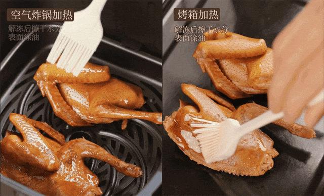 解冻后,用空气炸锅或者烤箱加热,即可吃到脆皮红烧乳鸽。