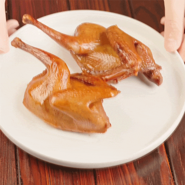 经过前序步骤的乳鸽,在家直接加热就是卤水乳鸽,嫩滑多汁,几乎不用费力咀嚼!(加热方法详见包装袋)