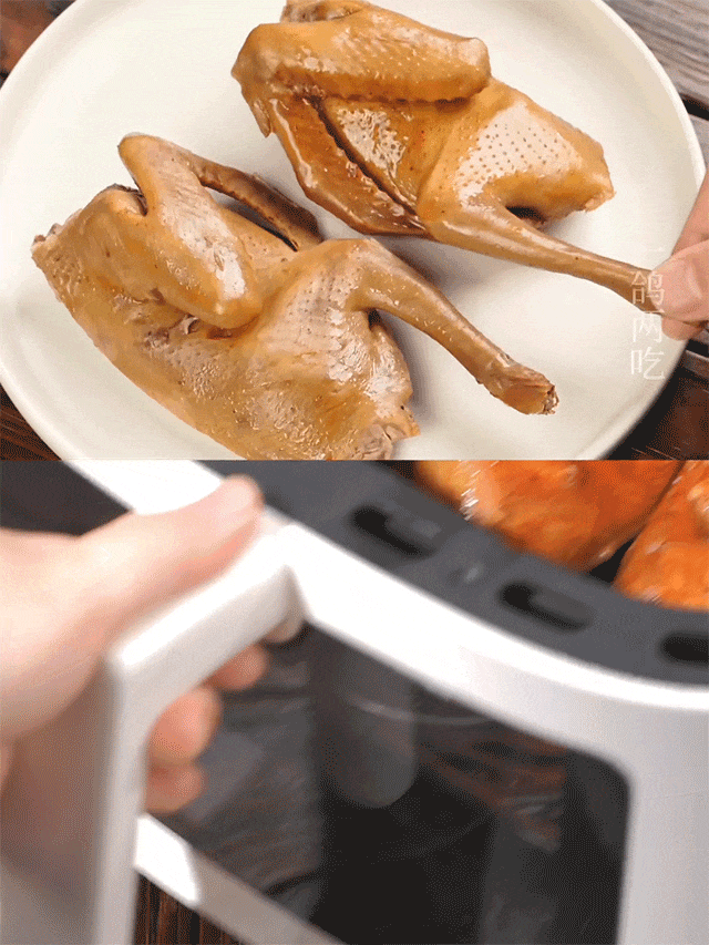 放入空气炸锅或烤箱,简单烘烤便是脆皮乳鸽,皮脆肉嫩的强烈对比更是惊艳!