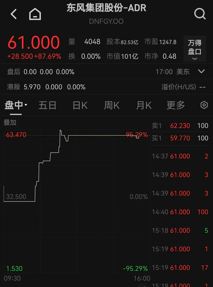 该公告一出,截至8月23日零点,东风集团股份ADR报价62.22美元,一个小时内暴涨超91%;收盘涨幅为87.69%,报61美元。