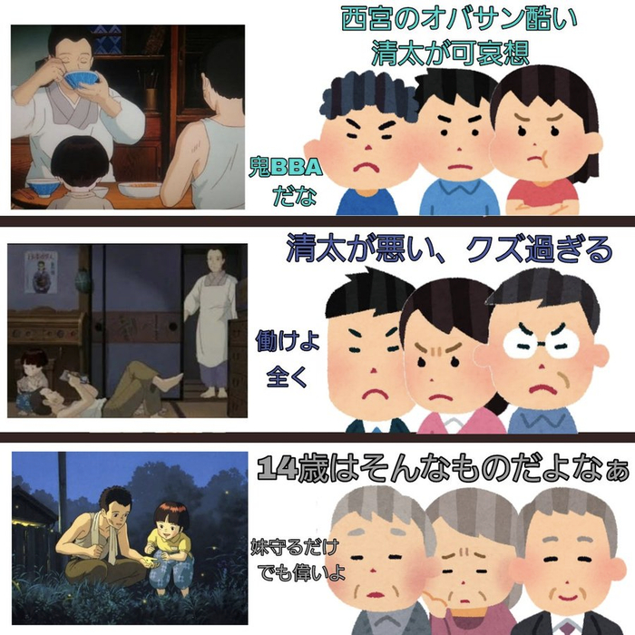 但现在,一种名为“西宫阿姨同情论”的观点开始流行,简单来说就是清太是垃圾,在战火中艰难拉扯一家的叔母,才是大好人。