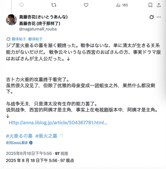在日本社交媒体里,很多人都分享了许多年前初看《萤火虫之墓》的感受,其中的关键情绪就是战争真可怕、清太一家真可怜、叔母好冷血(网络习惯称为西宫阿姨)。