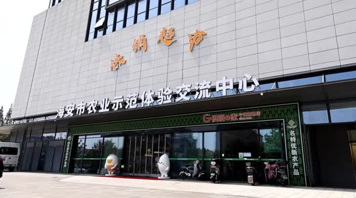 在海安农业示范体验交流中心(供销超市)里,货架上整齐陈列着生鲜果蔬、休闲零食、米面粮油、居家百货等商品。供销超市里还精心打造了“海安名优农产品专区”,汇集了麻虾酱、糯米陈酒等200多种具有地理标志和地域特色的优质农产品。于女士是超市的老顾客了,她穿梭其间,不一会儿购物车里就装得满满当当。于女士说:“我买了一些鸡蛋、肉菜,品质很好。鸡蛋上印有清晰可见的新鲜日期,还有二维码,扫码就能知道它们的来源。超市里的环境很好,工作人员服务很热情,没有菜市场的喧闹,逛着很舒服。里面还能看到一些人文景观,透着海安的文化底蕴。”