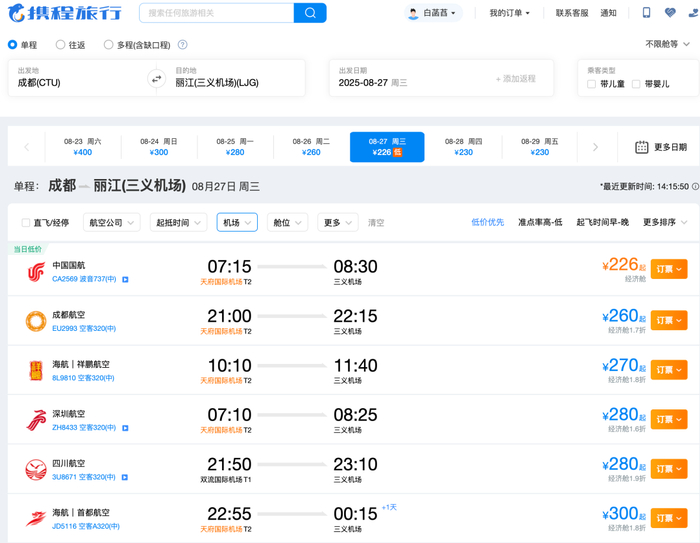 “太便宜了,现在成都飞拉萨的最低票价仅400元,而本月初的价格普遍上千元。”市民何先生因出差需要预订了本月底飞拉萨的机票,不到2折的票价让他感到意外,而十多天前他出差飞拉萨的票价为1400多元。