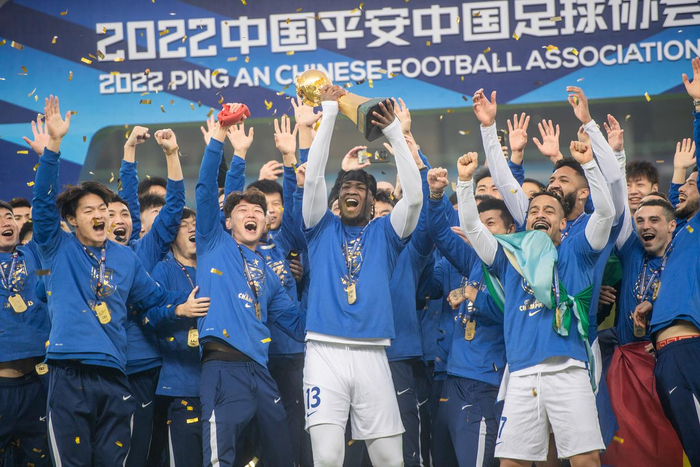 2022年12月31日,武汉三镇队球员在颁奖仪式上庆祝夺得中超冠军。新华社记者 伍志尊 摄2022年