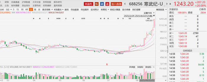 其中寒武纪股价接连突破1100元和1200元两大关口,最终20CM涨停封板,收盘价达1243.20元,总市值站上5200亿元。