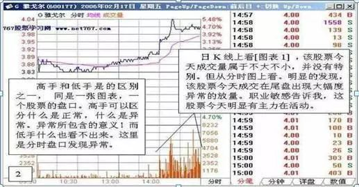 后面两种情况股价下午都是冲高回落走势,收盘出现长上影线。而且下一交易日股价大都会出现继续下探调整。如何确定目标股票是庄家震荡推高股价吸筹,而且当天买入不会被套?多年的实践发现:一般目标股票是真正实力庄家吸筹,吸筹当日股价都能维持较强表现走势收盘,也只有当日股价都能维持较强势表现收盘的品种才是短线机会好机会。