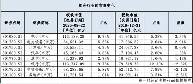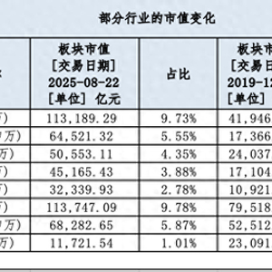 回望2019年底,申万行业中,银行和非银金融行业曾以7.95万亿元和5.25万亿元的市值稳居行业前两位,加上房地产行业,三大传统板块合计市值占比接近24%。然而时至2025年8月,虽然银行板块市值增长至11.37万亿元,非银金融增至6.83万亿元,房地产达到1.17万亿元,但三大板块的市值占比分别降至9.78%、5.87%和1.01%,合计减少超过6.95个百分点。