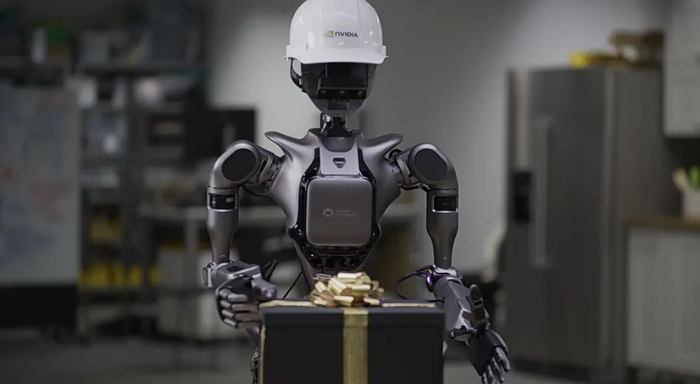 至于礼盒中的内容,英伟达已在两天前发出了预告视频。在视频中,黄仁勋俯身在贺卡上写下“致机器人:好好享受你的新大脑吧!”,随后镜头切换至一个站在礼盒前的人形机器人,正拿起贺卡“阅读”。