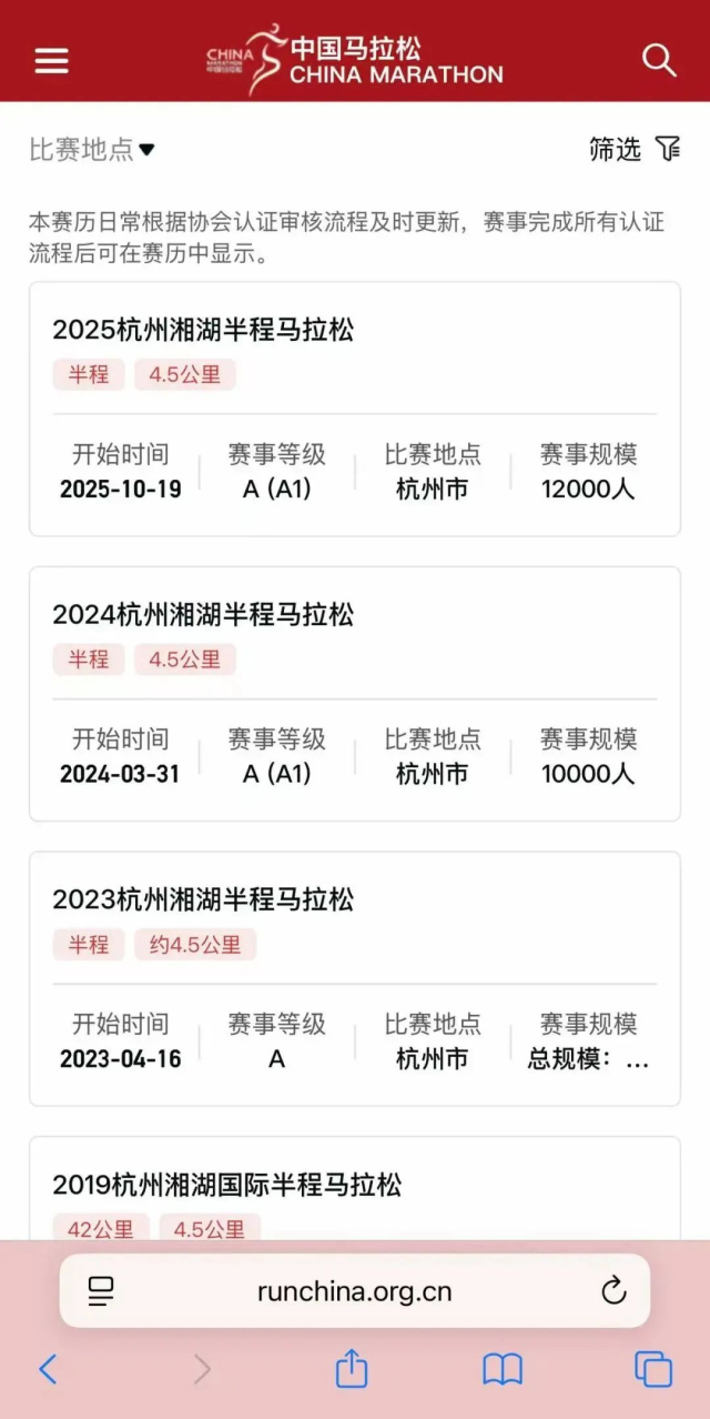 2025杭州湘湖半程马拉松已经通过中国田径协会马拉松A1类赛事认证。