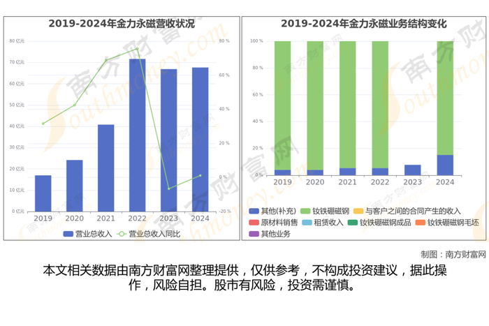 金力永磁2024年数据显示(如上图),公司2024年营业收入67.63亿,同比增长1.13%,近五年复合年增长率29.33%。