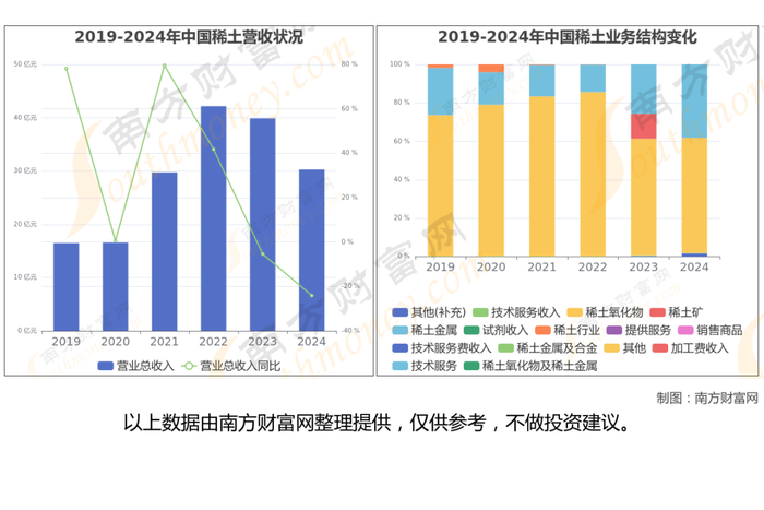 (如上图)2024年中国稀土公司营业总收入为30.27亿,同比增长-24.09%,近5年复合增长率为16.27%。