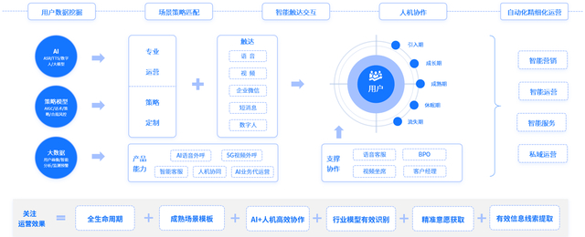 在获客阶段,通过AI语音、5G视频、智能短信、APP推流等方式,结合精准的用户画像和行业模型,对潜在用户进行批量触达。