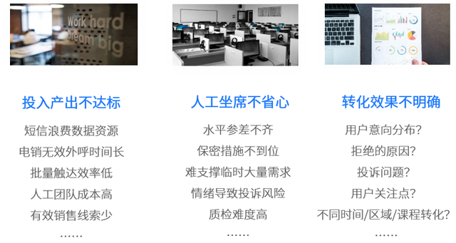 在用户运营上,缺乏准确的用户画像,无法清晰了解用户意向分布、拒绝原因、关注点以及不同时间、区域、课程的转化情况,难以实现高效的人机协作和智能化的任务执行与决策,在降低成本、提高效率、触达用户策略、挖掘数据价值等方面存在强烈诉求。