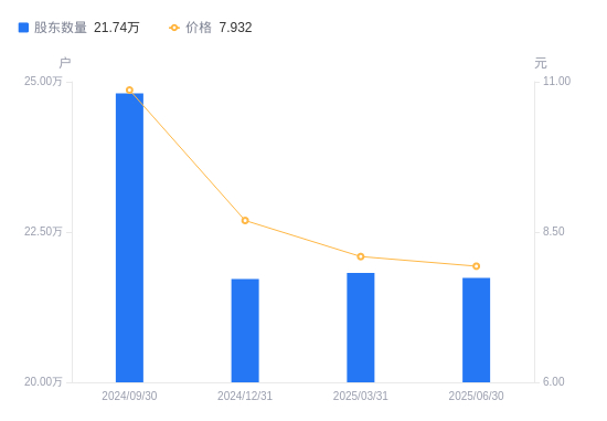 8月26日消息,数据显示,截至2025年6月30日,保利发展A股股东总户数为21.74万户,较上期(2025年3月31日)减少801户,降幅0.37%。公司最新A股总股本为119.7亿股,其中流通A股119.7亿股,户均持有流通A股数量为5.51万股,较上期增加202.14股,增幅0.37%;户均持流通A股市值43.68万元,较上期减少7174.5元,降幅1.62%。