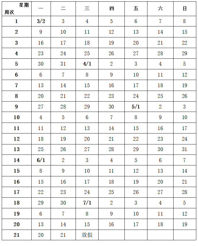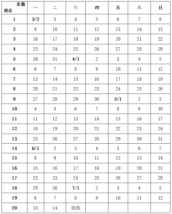 第二学期校历