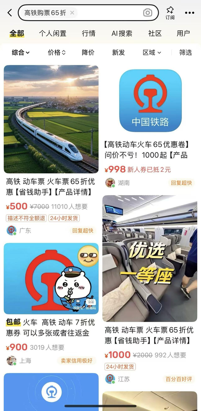 “问价不亏!高铁票6.5折优惠,200起订。”正逢开学及暑期出行高峰,有网友发现,在闲鱼等线上交易平台出现了票务代理或个人卖家售卖低价高铁票。其票源是否合规、交易过程中是否有风险,成为网友热议的话题。
