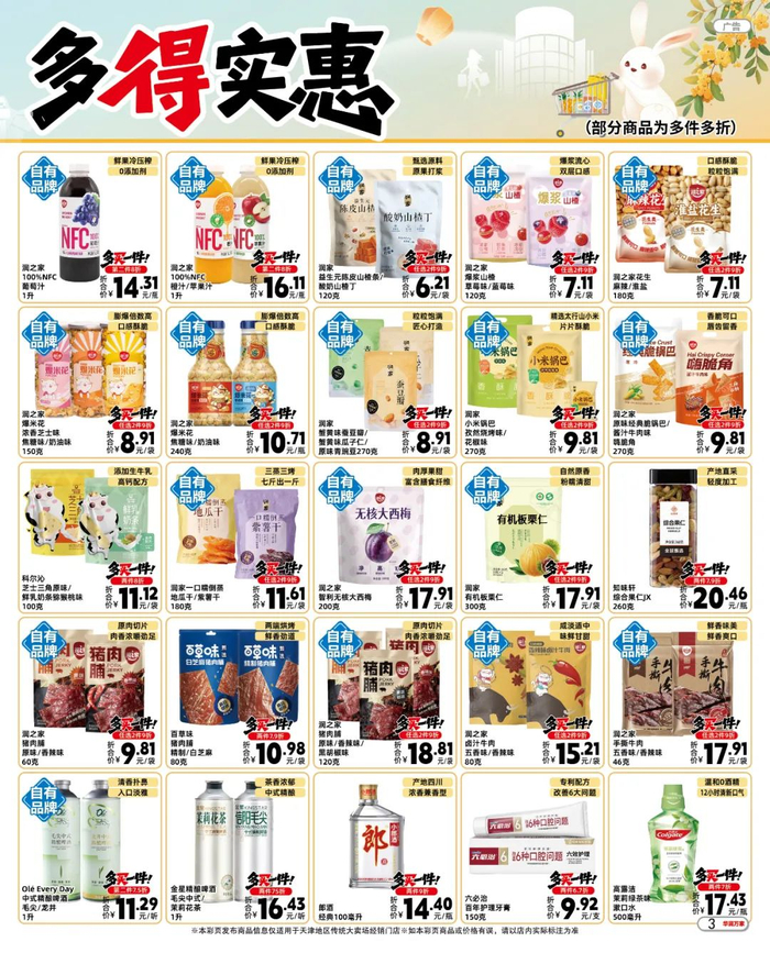 华润万家自有品牌商品覆盖休闲食品、生鲜、生活家居等品类,以优质优价承包消费者的美好生活。其中多项爆品均参与“多买一件多得优惠”与“跳水价”福利活动,原料只有果汁的润之家100%NFC橙汁第二件8折、一口爆浆的山楂任两件9折,还有融合传统毛尖茶香的Olé Every Day中式茶饮第二件7.5折……用实在的品质与价格,让每一位天津市民畅享惬意悠长的假日生活。
