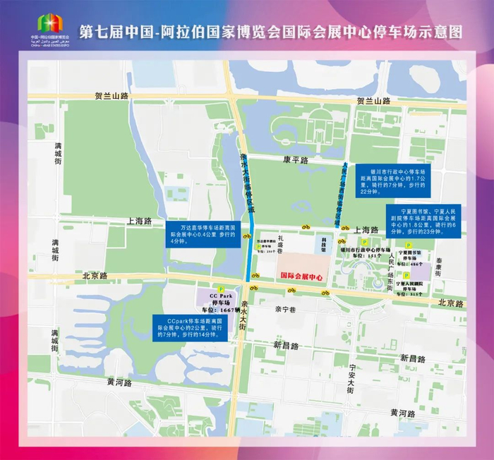 为方便参观群众有序停车,博览会期间可使用手机“扫一扫”停车二维码,实时了解银川国际会展中心周边停车场停车地点和停车泊位相关情况,精准导航、提前规划、择路通行。