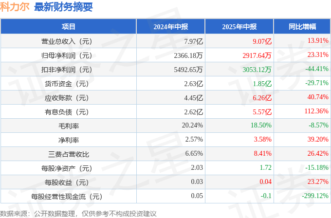 科力尔(002892)2025年中报简析:营收净利润同比双双增长,应收账款上升