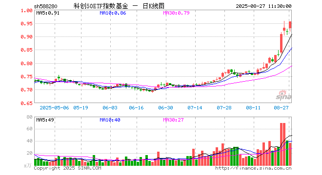 8月27日,截止午间收盘,科创50ETF指数基金(588280)涨4.14%,报0.955元,成交额3455.48万元。科创50ETF指数基金(588280)重仓股方面,中芯国际截止午盘涨5.47%,海光信息涨1.61%,寒武纪涨6.01%,澜起科技涨10.31%,中微公司涨1.68%,金山办公涨4.67%,联影医疗涨1.17%,传音控股涨5.27%,九号公司涨0.58%,芯原股份涨8.19%。