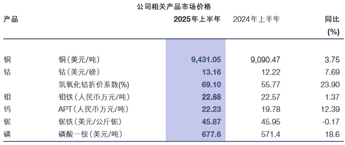 产销量最大的铜今年上半年均价为9,431.05美元/吨,同比上升3.75%;钴价为13.16美元/磅,同比上升7.69%。此外,钼、钨、磷产品均有不同程度的上涨。