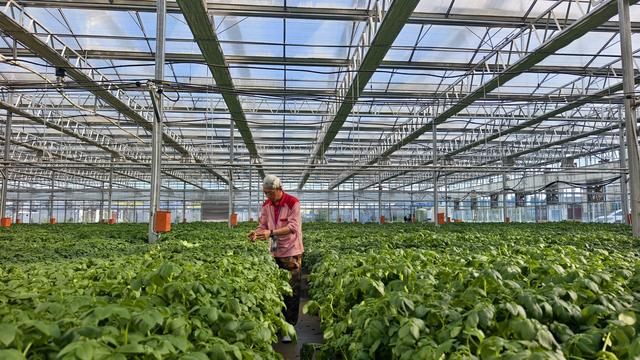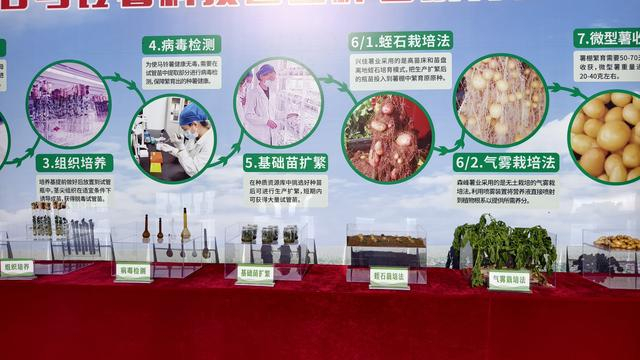8月27日,在呼伦贝尔市牙克石市兴佳薯业的玻璃钢智能温室中,工人正在检查脱毒马铃薯原原种的生长情况。
