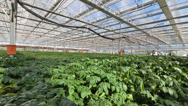 每个玻璃钢智能温室面积5.2亩,安装83台苗床,培育约70万株种苗。脱毒马铃薯原原种在整个繁育阶段,根据不同品种,制定科学的营养液以及植保防护,配置全自动喷洒车进行喷洒,一季能够产出约180万粒种子,一年产量能达到500万粒左右。由于智能温室自动化程度较高,每个智能温室只需配备一名工人进行管理,育种全程效率高、产量高。