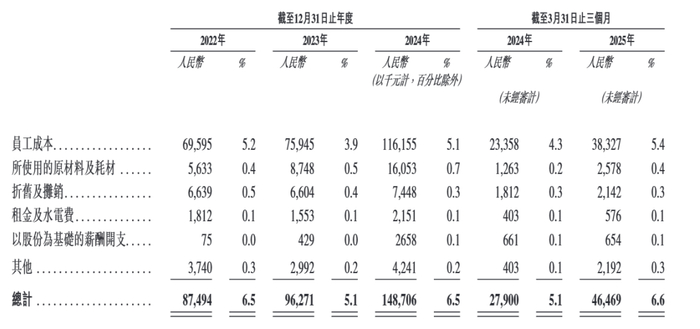 2022年-2024年及2025年一季度(以下称“报告期”),创想三维的研发开支分别为8750万元、9630万元、1.49亿元及4650万元,分别占公司总收入的6.5%、5.1%、6.5%、6.6%。