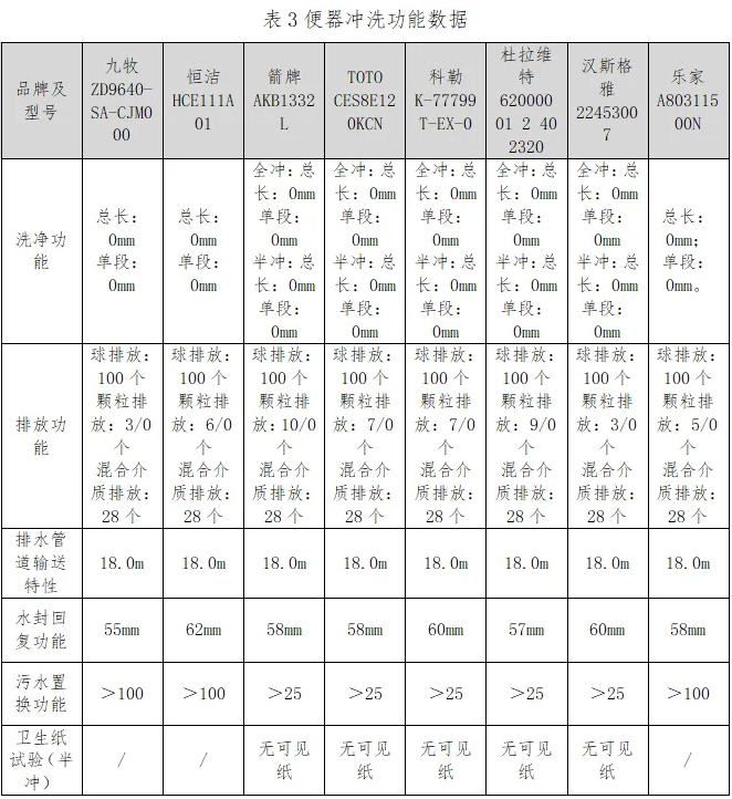 冲洗功能是智能坐便器的一个重要性能指标。不合格的产品,在使用一段时间后,在水流无法到达的位置易出现污物残留,产生异味,滋生病菌,同时易降低坐便器防臭能力,也易造成坐便器排污口堵塞,影响使用。根据GB/T 6952-2015《卫生陶瓷》标准测试8个样本冲洗功能,全部符合标准要求。