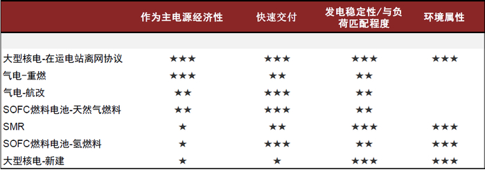 主电源选择上,我们观察到从在运核电→新建重燃→新建航改型燃机→新建燃料电池、SMR的逐步渗透: