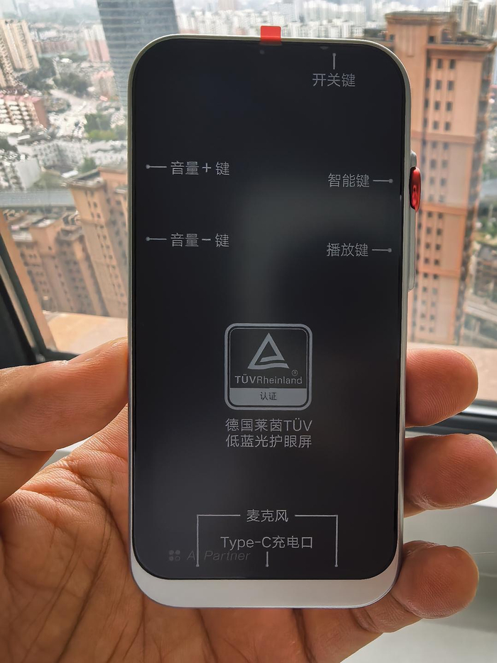 M7的设计跟手机类似但又比手机小巧。设备正面是一块4.02英寸的黑色全面屏,搭配银色金属漆边框和右侧的红色按钮,营造出不错的高端感。 背面采用磨砂塑料与反光膜结合的设计,珠光白后盖有效避免了指纹残留的问题。