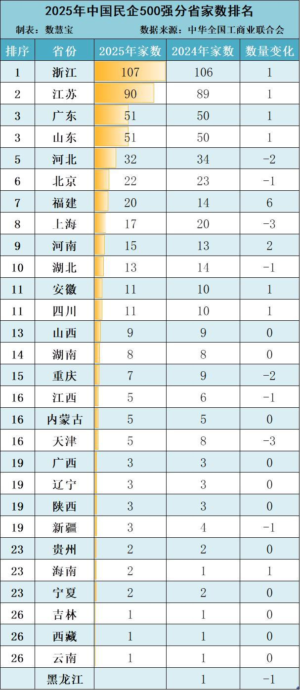 浙江依旧是最多的省份,达到107家,增加1家。江苏以90家排第二,也增加了1家。广东和山东都是51家,并列第三。四个经济大省500强企业数量达到299家,占比59.8%,接近60%,集中度非常高。
