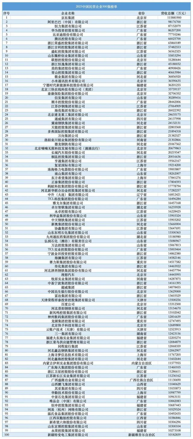 “2025中国民营企业500强”名单出炉了,京东再次拿下第一。